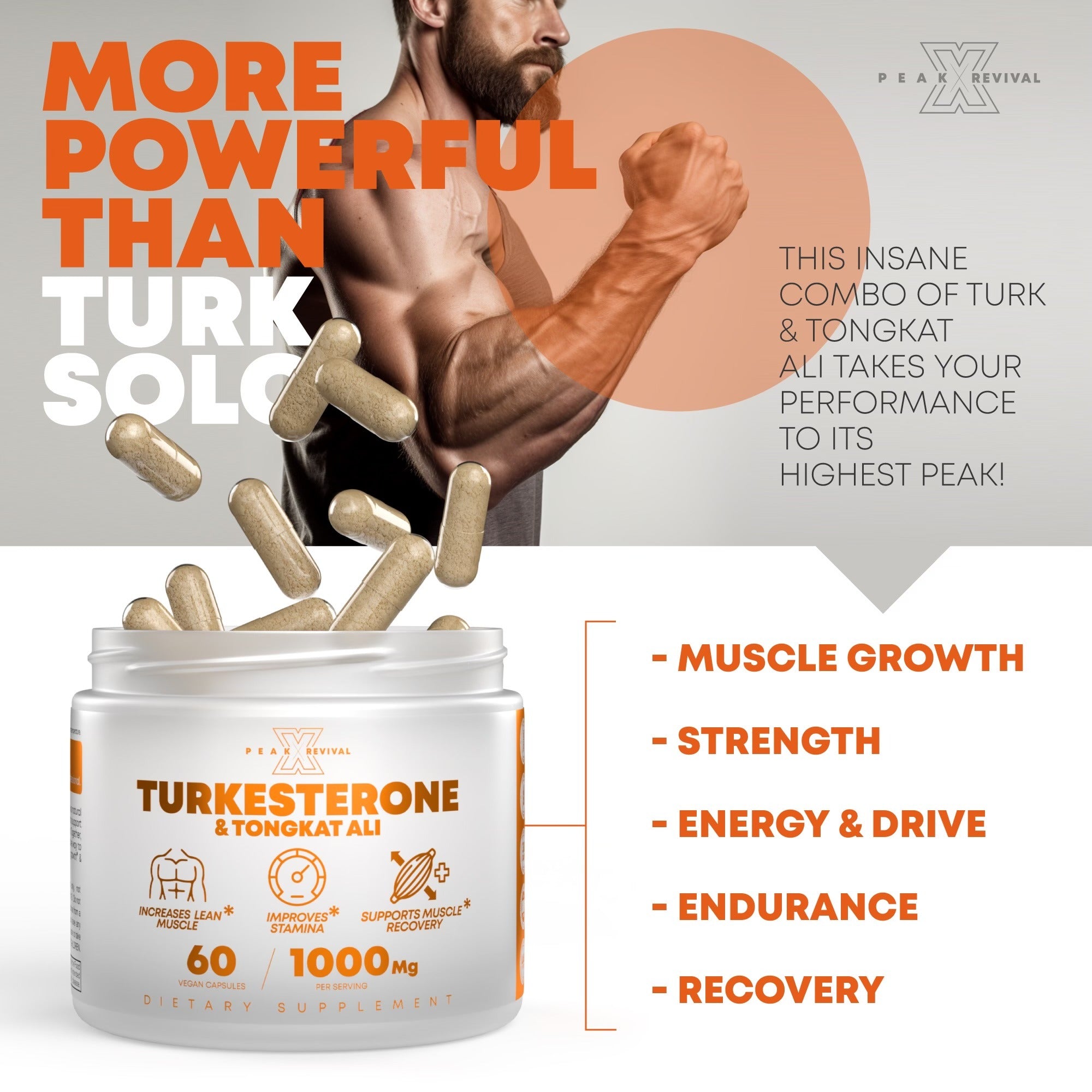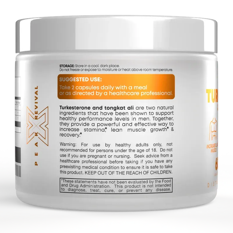 Peak Revival-X™ Turkesterone & Tongkat Ali is a premium botanical blend designed to support muscle development, enhance recovery, and boost athletic performance. Our formula combines powerful Turkesterone with Tongkat Ali and Colostrum to deliver 1000mg per serving of natural botanical support. Crafted in the USA, third-party tested, and formulated for clean daily support.